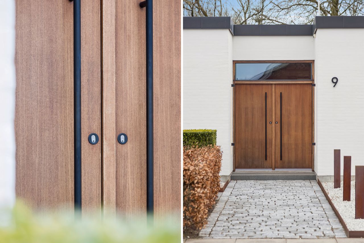 Den raffinerede facade mod vejen trækker tråde til områdets klassiske villaarkitektur fra 60’erne og 70’erne – men med et moderne, minimalistisk udtryk. Den dobbelte teaktræsdør fungerer som arkitektonisk signatur – et diskret, men markant statement, der afspejler villaens eksklusive karakter.