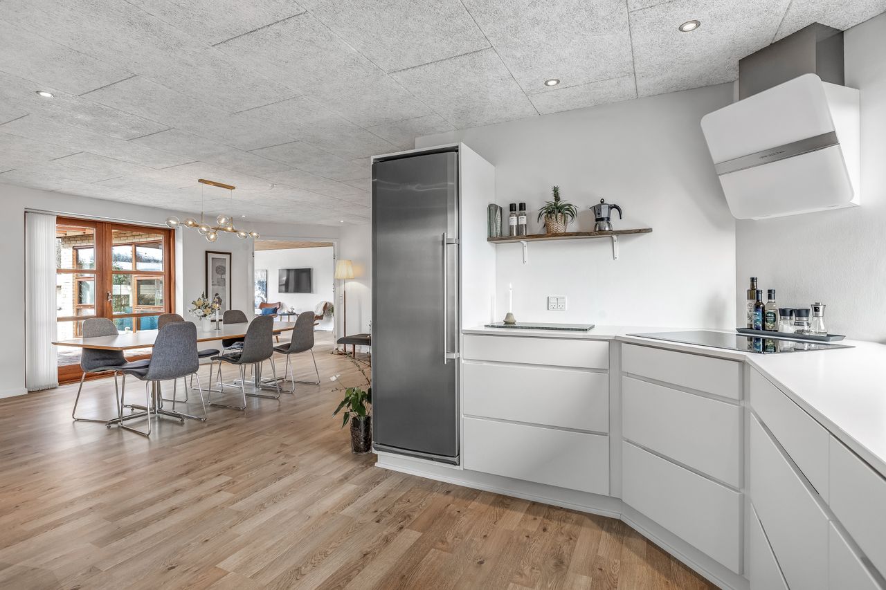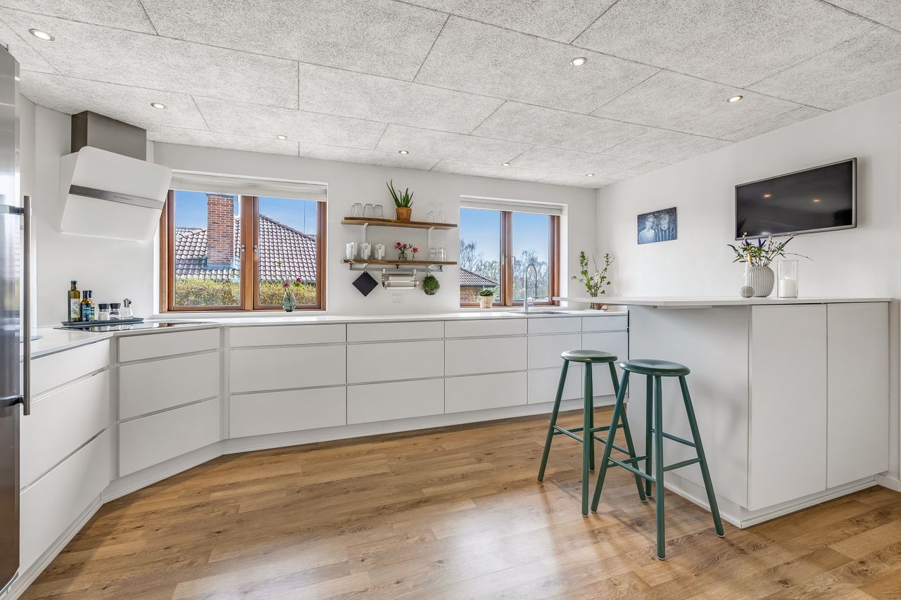 INDRETNING: Som det første træder man ind i en dejlig entre med sorte klinker, gulvvarme og spots. Flot gæstetoilet med sorte klinker og gulvvarme. Herefter møder man hjerterummet i huset. Et lækkert stort Kvik køkken fra 2015 med hvide låger, "bardisk", hvor morgenmaden indtages og dejligt stort alrum, hvorfra man kan gå direkte ud på den mest fantastiske overdækkede terrasse, som virkelig byder på hygge og afslapning samt udsigt over haven. Lækker, stor lys stue med brændeovn fra 2017 og fransk dør til alrum/køkken. Værelse. Fordelingsgang med sorte klinker og trappe til underetagen. Soveværelse med skydeskabsarrangement. Flot, stort badeværelse med loft til kip, håndvaskearrangement med støbt betonvask, dobbelt bruseniche, håndklædetørrer, sorte klinker og gulvvarme. Stort værelse med 2 faste skabe. UNDERETAGEN: Bagindgang med faste skabe og udgang til dobbelt carport. Endvidere er bagindgang/bryggers med faste skabe, bord samt vask. Godt vaskerum med vaskesøjle, bord samt faste skabe. Pænt badeværelse med håndvaskearrangement i støbt beton, bruseniche, hvide klinker og gulvvarme. Stort værelse/multirum, som er med i boligarealet og med skydeskabsvæg. Endvidere er den gamle garage bygget om til et stort hobbyrum med masser af faste skabe.