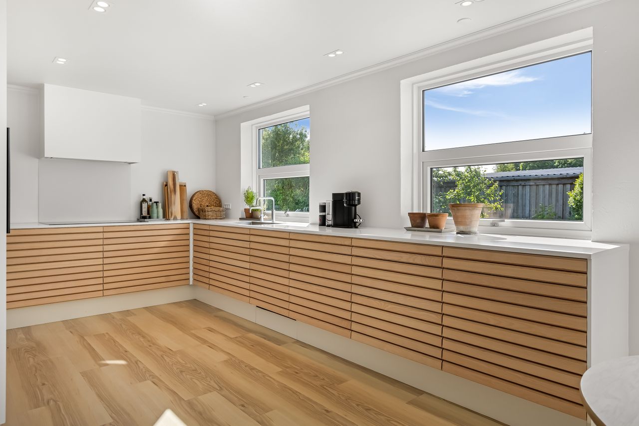 INDRETNING: Det første man møder, når man træder ind i denne fantastiske villa, er en pæn entre med trappe til 1. sal. Dernæst møder man hjerterummet. Et elegant og stilfuldt køkken/alrum fra Svane med smukke lamelfronter fronter i hvidpigmenteret ask og med flot bordplade samt spots i loftet. Det imponerende køkken/alrum giver både plads og mulighed for hygge og masser af gæster. Endvidere finder man en karnap i stuen, som giver det smukkeste lysindfald, både sommer og vinter. Herfra er der udgang til den skønneste have. Køkken/alrum og stue er i åben forbindelse til hinanden og har lyse gulve overalt. Lækkert badeværelse fra Svane med håndvaskearrangement med støbt vask, bruseniche, spot i loftet, polyurethan gulv samt gulvvarme. Teknikrum. Værelse/kontor med polyurethan gulv. Bryggers fra Svane med bord og vask samt skydeskabsarrangement og polyurethan gulv. Stueplan fremtræder yderst stilfuld og elegant. 1. SAL: Repos. 2 værelser med lyst trægulv og spot i loftet. Flot badeværelse med støbt vask, bruseniche, lyse klinker samt gulvvarme. Dejligt stort soveværelse med skydeskabsarrangement samt lyst gulv.