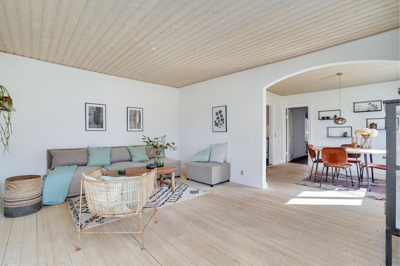 INDRETNING: Pæn entre med trappe til dejlig tør kælder. Dejligt køkken med lyse låger, massiv bordplade og godt med skabsplads. Herefter træder man ind i hyggelig dobbelt stue, hvoraf den ene anvendes som spisestue og den anden som tv og hyggestue. Stort soveværelse.. Pænt lyst badeværelse med håndvaskearrangement, bruseniche, lyse klinker og gulvvarme. Værelse. KÆLDER: Stort godt disponibelt rum med lyst trægulv. Vaskerum med lyse klinker og opgang til gårdhaven. Yderligere 2 gode lyse disponible rum. En god og anvendelig kælder.