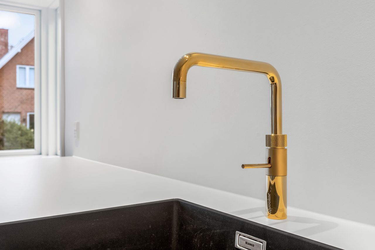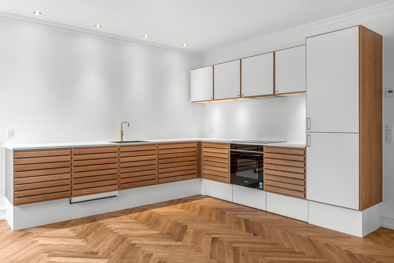 Allerede når man træder ind i den smukke entré og opgang kan man tydeligt se og mærke historiens vingesus. De smukke høje paneler og den flotte trappe byder velkommen til en helt særlig bolig. Hjertet i denne ejerlejlighed er uden tvivl det smukke og klassiske køkken fra Unoform, der med sine eksklusive detaljer og gennemførte stil, komplementerer det flotte sildebensgulv på fornemmeste vis. Fra køkken/alrum er der åben forbindelse til den hyggelige stue, hvor de flot udskårne gerigter og den gode loftshøjde skaber et unikt rum. I ejerlejligheden finder du også et soveværelse med direkte udgang til terrassen og gårdhaven, samt et stort værelse/kontor. Det skønne badeværelse er mindst lige så gennemført som resten af ejerlejligheden. Her kommer de fine messingdetaljer tydeligt til sin ret, og det smukke badmøbel i egetræ med fingertappede skuffer, samt håndklædetørrer og stor bruseniche med glasvæg passer perfekt hertil.