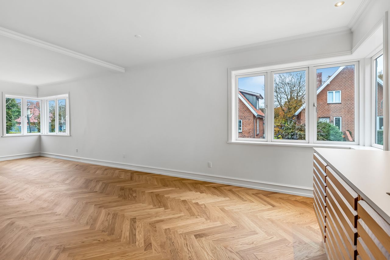 Ejerlejligheden er istandsat med øje for de originale detaljer, der tydeligt er blevet en del af den gennemførte renovering. Her er der ikke gået på kompromis med hverken æstetik eller kvalitet. Den store renovering er lavet i 2024-2025, hvor alt el og vvs er skiftet i hele huset. Alle materialer er nøje udvalgt og det hele bindes sammen af det eksklusive og massive sildebensgulv, som er fra Hørning Parket, 22 mm og fuldlimet. Messingdetaljer går igen på en elegant og underspillet måde – blandt andet på dørhængsler, dørgreb, i spots og på det flotte badeværelse.