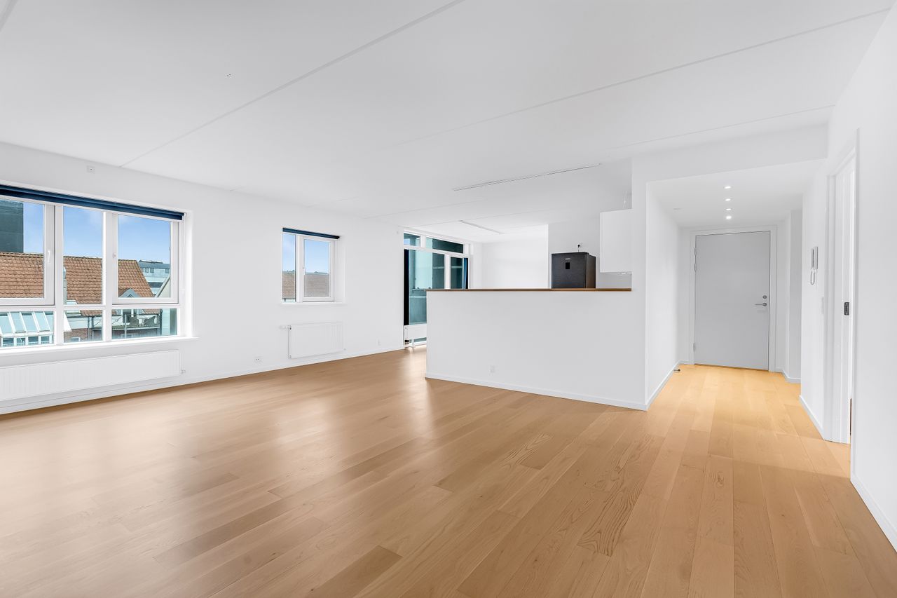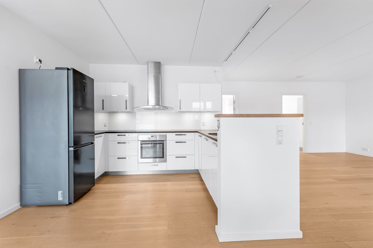 Overalt i denne ejerlejlighed er der et fantastisk lysindfald, og så er der dejlig meget plads til både indretning og gæster. Det store køkken/alrum smelter sammen med stuen, og giver derfor masser af muligheder for at samle hele familien til fødselsdag eller jul. Køkkenet er dejlig lyst med masser af skabs- og bordplads til både madlavning og bagning. Fra køkkenet er der udgang til den fantastiske altan med et skønt kig mod syd. Altanen er overdækket, så man samtidig kan finde en skyggeplet eller lade havemøbler og hynder være ude på en regnvejrsdag. Det flotte lyse badeværelse med bruseniche har gulvvarme, og det store soveværelse har faste skabe. I ejerlejligheden har du også et rigtig godt ekstra værelse, så der kan evt. kan laves et kontor, et gæsteværelse eller måske en hyggelig tv-stue.