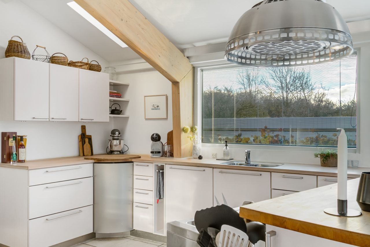 Villaens hjerte og familiens samlingspunkt er uden tvivl det store køkken/alrum med det helt fantastiske lysindfald. Der er højt til loftet, og kig til de synlige hanebånd. Der er en dejlig sammenhæng mellem køkken, alrum og stuen med den hyggelige brændeovn. Og uanset, hvor man kigger hen, er der udsigt til haven og de skønne grønne omgivelser. Der er praktiske skydedøre fra alrum og til terrasser. To rigtig gode værelser samt et stort soveværelse, hvor to værelser pt. er sammenlagt til ét stort soveværelse. Det vil sige, man har i alt 4 soverum i denne villa. Også i villaens værelser er de arkitektoniske løsninger gennemtænkte og ovenlysvinduerne og lofthøjden giver en skøn rumfornemmelse. Desuden er der et lækkert badeværelse med bruseniche samt et stort gæstetoilet, hvor der nemt ville kunne laves en bruseniche.