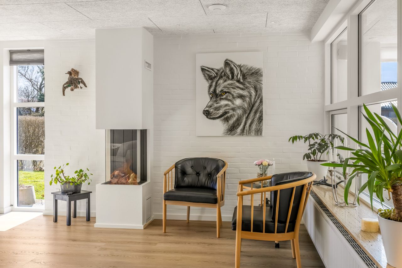 Stuen er lys og indbydende - hyggelig på alle måder og så er der blevet etableret en super fin gaspejs, som er med at til skabe den helt rigtige, hyggelige stemning i stuen. Fra stuen er et åbent og flot kig gennem det store vinduesparti direkte ud i havestuen.